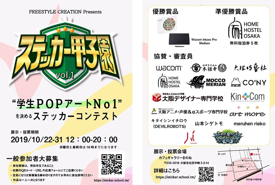 フリースタイルクリエーションが主催する学生によるステッカーデザインNo.1を決めるコンテスト。「カフェギャラリーきのね」では全作品がステッカーとなり展示投票に!twitterでのRT投票も行われているので、@stickerkoushienで検索して是非ご参加下さい。
